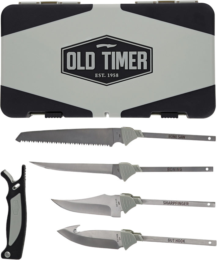 Includes: 6" Bone saw blade; 5.25" Boning blade; 4" Sharpfinger skinner blade; 3.75" Guthook blade. 5.25" handle with rubber grip.... Read more