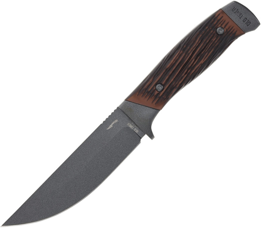 9.75" (24.77cm) overall. 5" (12.7cm) gray coated stainless blade. Gray stainless handle with Delrin inlay. Full tang. Brown leather and... Read more