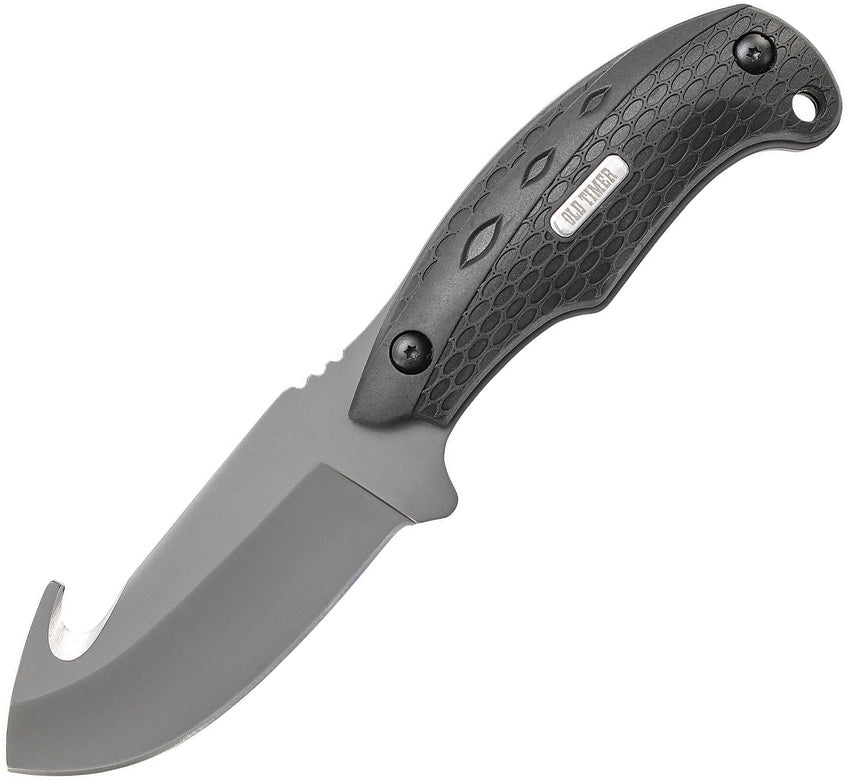 Old Timer. 8" (20.32cm) overall. 3.5" (8.89cm) gray TiNi coated 7Cr17MoV stainless guthook blade. Black textured rubber handle. Full tang.... Read more