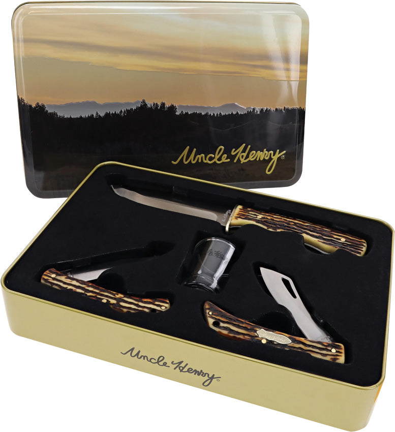 Uncle Henry. Satin finish stainless blade. Staglon handle. Includes: 8.25" overall hunter with 4" blade; 3.5" folder with 2.5" blade,... Read more