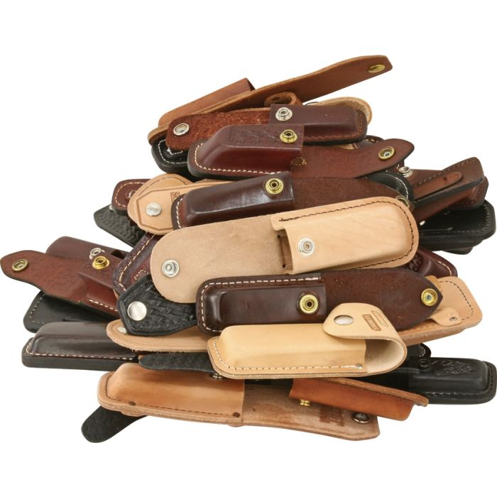 Assortment of 25 folding knife sheaths of various sizes. Assortment will vary from one pictured. Bulk packed.…......Please note the the... Read more