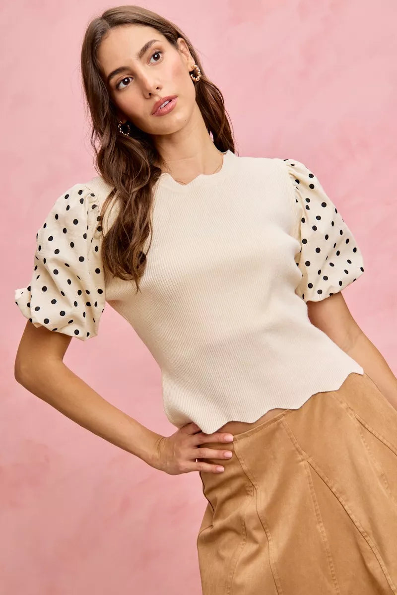 The Polka Dot Contrast Woven Balloon Sleeve Blouse is a chic and sophisticated addition to your wardrobe. Featuring a classic polka dot pattern, this blouse offers a timeless and stylish look. The contrast woven details on the balloon sleeves add a modern and eye-catching touch. With its balloon sleeves providing a dramatic and fashion-forward silhouette, this blouse is perfect for making a statement. Dress it up or down for versatile styling options that suit any occasion. Elevate your fashion game with the Polka Dot Contrast Woven Balloon Sleeve Blouse and showcase your trendy and elegant style effortlessly.