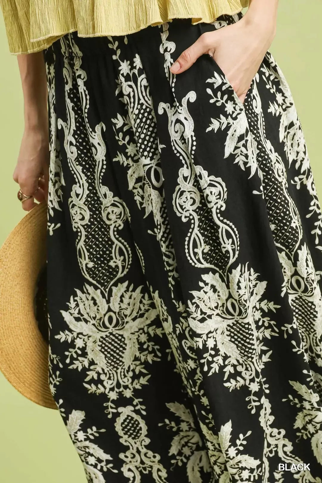 The border print wide leg bottoms are a statement piece that combines style and comfort effortlessly. Featuring a bold and eye-catching border print design, these bottoms add a chic and unique touch to any outfit. The wide leg silhouette offers a flowy and relaxed fit, providing both elegance and ease of movement. Perfect for creating fashionable looks, these bottoms can be paired with a variety of tops for versatile styling options. Elevate your wardrobe with these trendy and versatile border print wide leg bottoms that are sure to make a fashionable statement.