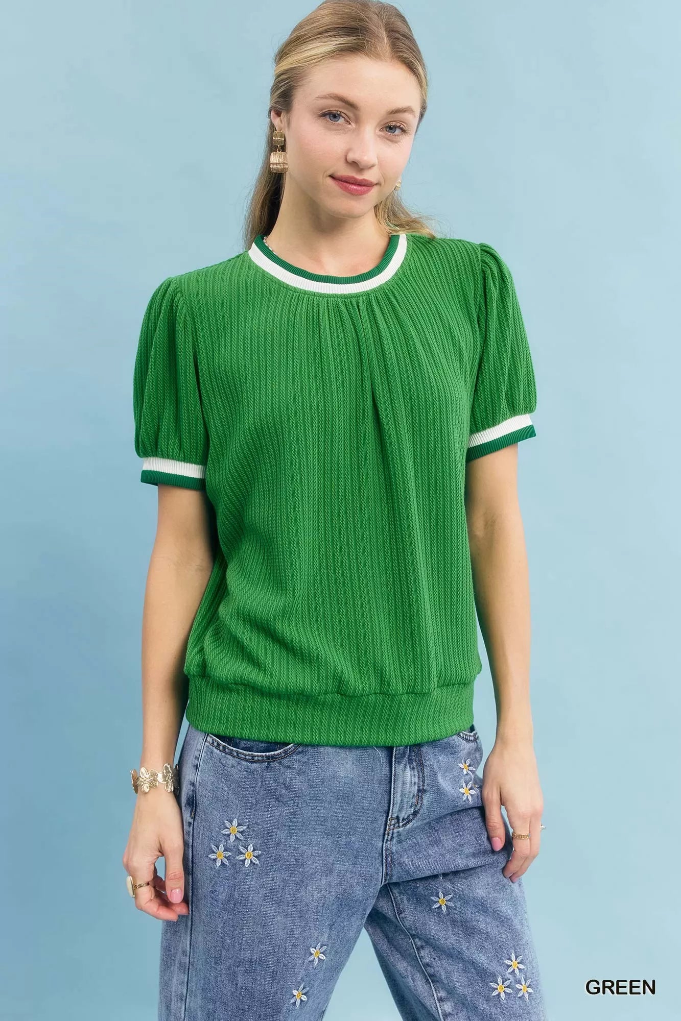 The Puff Sleeve Knit Top is a chic and stylish wardrobe staple with a trendy twist. It features a classic crew neckline with contrast rib trim for added visual interest. The short puff sleeves add a touch of femininity and flair to the design. With a ribbed hem and contrasting details, this top offers a modern and sophisticated look. Please note that this top is not lined, allowing for breathability and a lightweight feel. Pair this versatile top with your favorite bottoms for a fashionable and comfortable outfit.