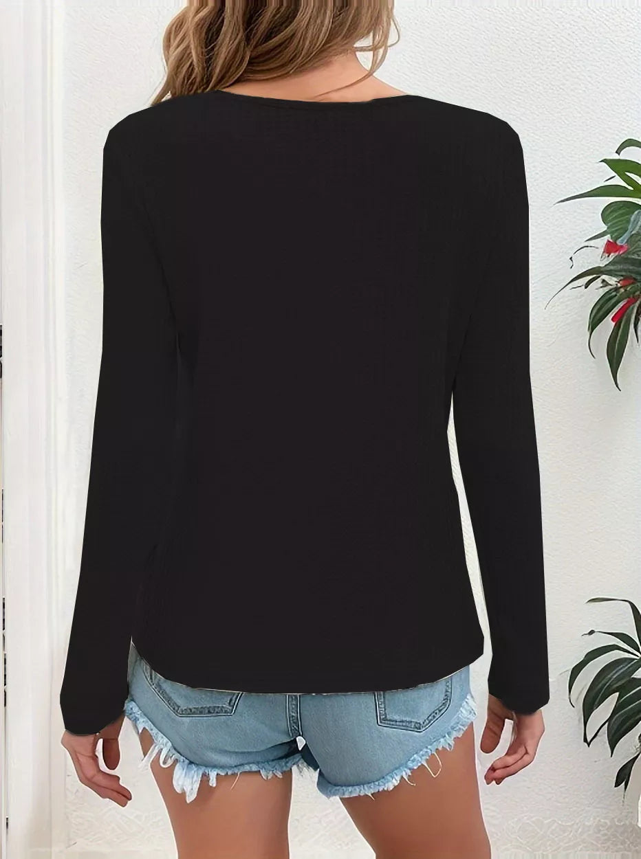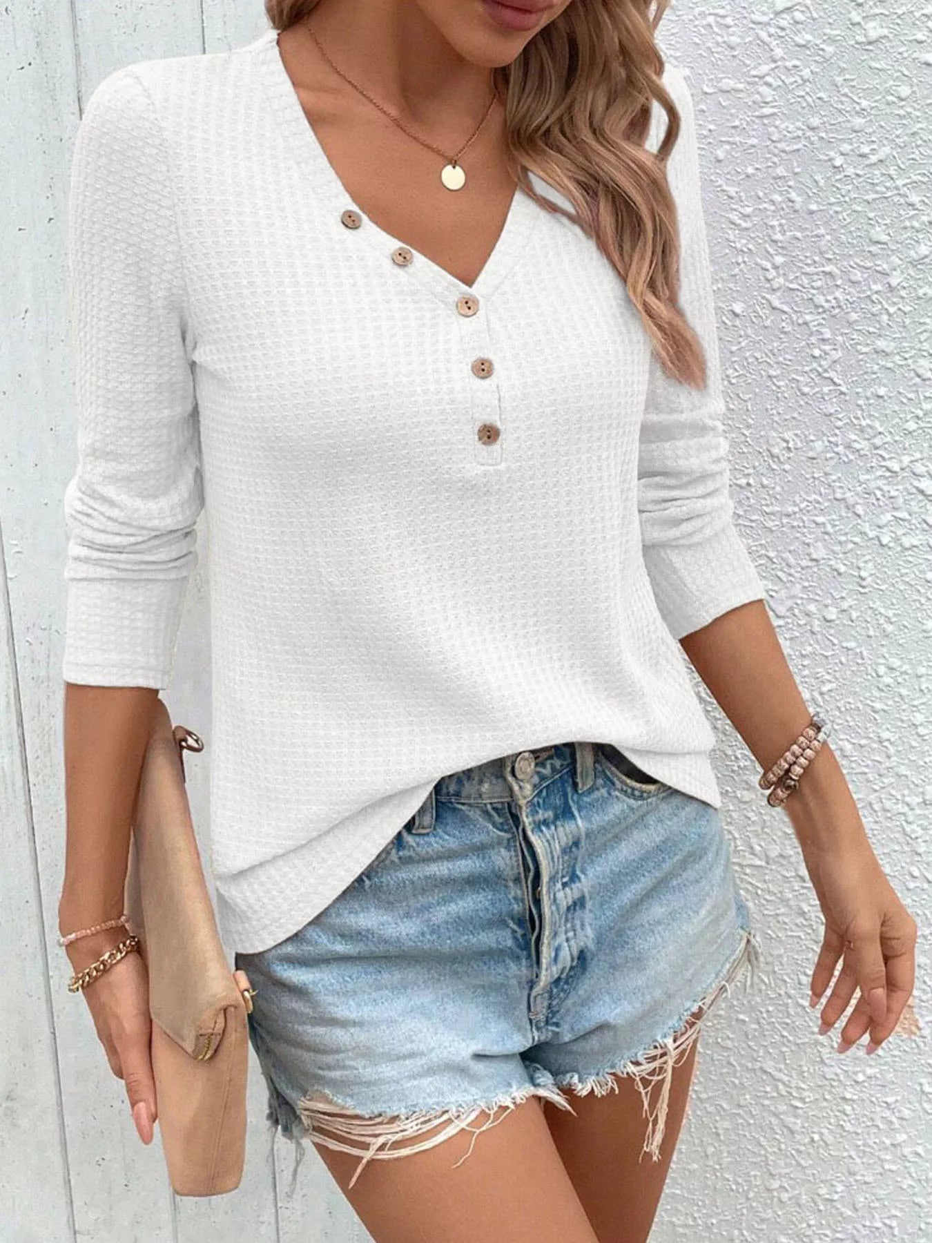 Waffle Knit Button-Detail V-Neck T-Shirt
